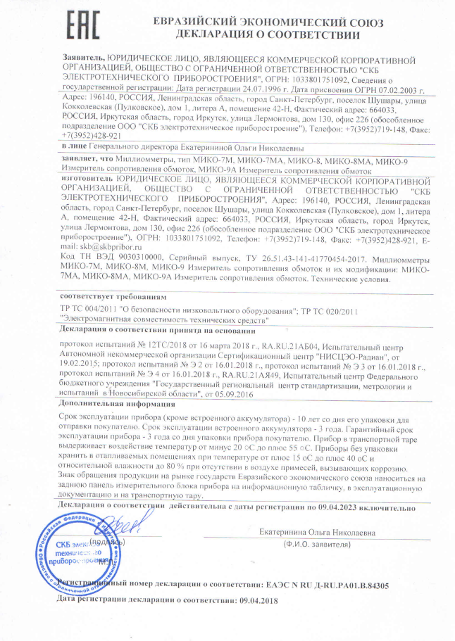 МИКО-9А соответствует требованиям безопасности EN 61010-1 и требованиям электромаг - нитной совместимости, которые предъявляются к оборудованию класса А по EN 61326-1.