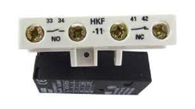 The ABB HKF is the auxiliary contact having 1 number of NO and 1 number of NC auxiliary contact. The rated operational voltage of the auxiliary contact is the 400 V and the current is the 4 A. This auxiliary contact have screw terminal._x000D_