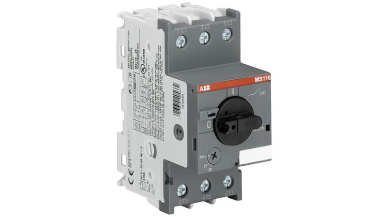 The MS116-20 manual motor starter (also known as motor protection circuit breaker or manual motor protector) is a compact 45 mm width device with a rated operational current of Ie = 20.0 A. This device is used to manually switch on and off motors and to protect them reliably and without the need for a fuse from short-circuits, overload and phase failures. The manual motor starter offers a rated service short-circuit breaking capacity Ics = 10 kA at 400 VAC and trip class 10A. Further features are the build-in disconnect function, temperature compensation, trip-free mechanism and a rotary handle with a clear switch position indication. The manual motor starter is suitable for three- and single-phase applications. Auxiliary contacts, signaling contacts, undervoltage releases, shunt trips, 3-phase bus bars, power in-feed blocks and locking devices for protection against unauthorized changes are available as accessory.