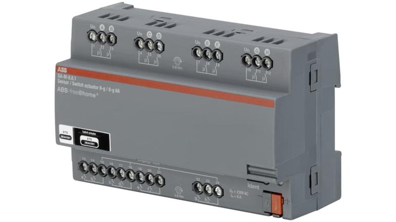 The ABB SA-M switch actuator is designed for installing on a mounting rail. The device has eight binary inputs as well as eight switching outputs. The binary inputs can be used as interface for the convenient operation of free@home systems via floating pushbuttons or for reading out technical binary signals._x000D_