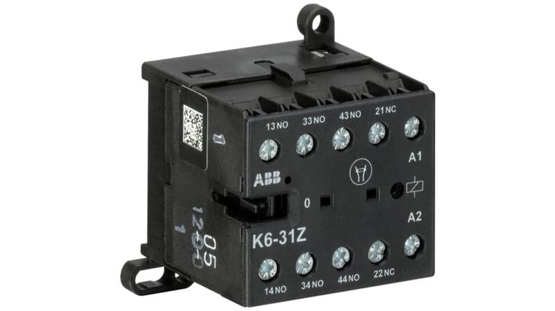 The ABB K6-31Z mini contactor relay is a compact 4 pole contactor relay with screw terminals. They are ideally suited for applications where reliability is a must and space is at a premium. Mini contactors relays are used in residential buildings, commercial buildings and industrial applications for switching of control signals up to 3 A / 400 V (AC-15). Further features are the silent coil, a switch position indication and the integrated possibility for rail or wall mounting._x000D_ Ambient Air Temperature: Operation -25 ... +55 °C, Storage -40 ... +80 °C_x000D_ Degree of Protection: IP20