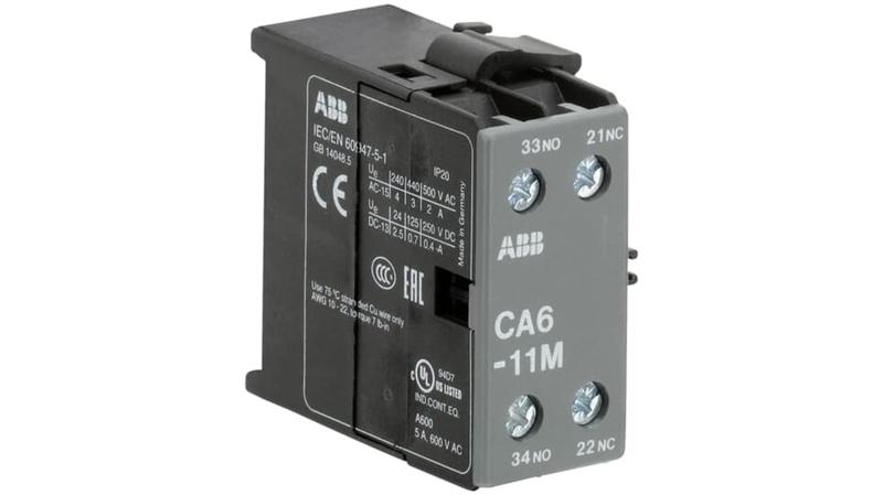 The ABB CA6-11M series 2 pole side mounted auxiliary contact has instantaneous N.O. and N.C. contacts. It has operational voltage of 690 V ac._x000D_