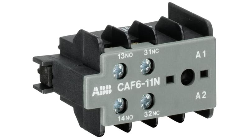The ABB has CAF6-11N is an auxiliary contact for front mounting with 2 auxiliary contact and screw terminals. The rated insulation voltage of the contact is 690 V and current is 6 A. This contact block has 1NO and 1NC contact._x000D_