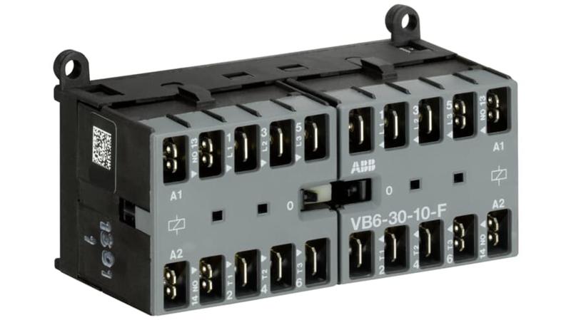 The ABB VB6-30-10-F mini reversing contactor is a compact 3 pole contactor with 1 auxiliary contact, flat pin connection and normal mechanical interlock. They are ideally suited for applications where reliability is a must and space is at a premium. Mini reversing contactors are used in residential buildings, commercial buildings and industrial applications for the control of three-phase motor loads up to 4 kW (AC-3). Further features are the silent coil, a switch position indication and the integrated possibility for rail or wall mounting._x000D_
