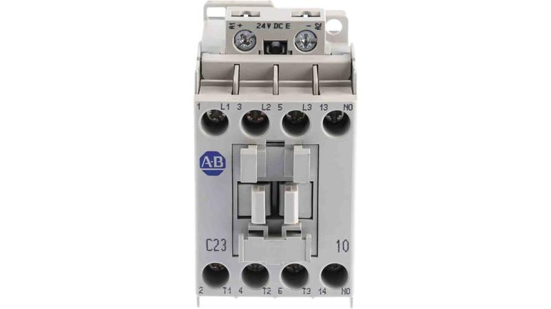 The 100-C23EJ10 model is a 3-Pole contactor by Allen Bradley. It has a 24V dc electronic coil and screw terminals. The contact current rating is 23A. It has 1NO 0NC auxiliary contact configuration. Coil termination is line side._x000D_