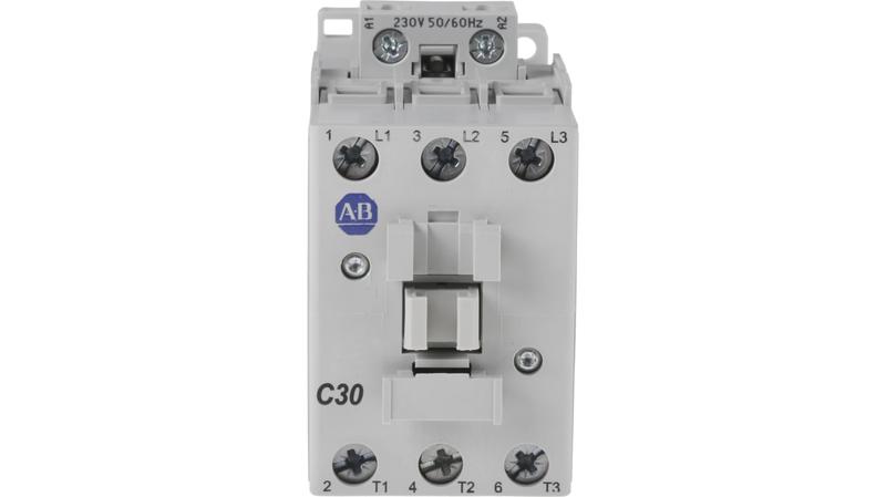 The 100-C30KF00 IEC contactor by Allen Bradley is a 3-pole contactor with a contact current rating of 30A, and a coil voltage of 230V ac. It has a power rating of 15kW and contact voltage rating of 690V ac. It has screw terminals. Coil termination is line side._x000D_