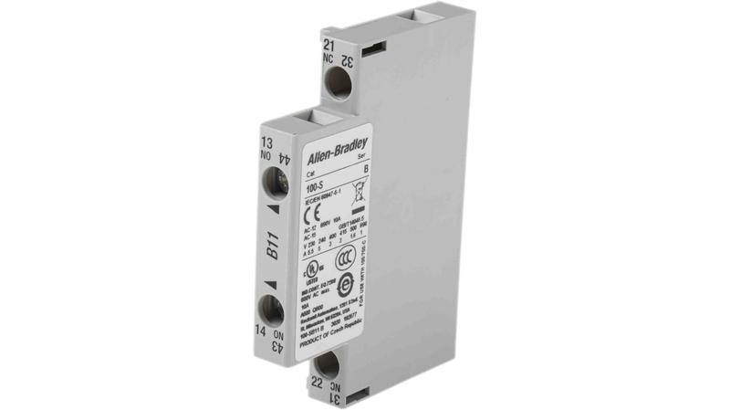 Maintain high levels of reliability in industrial process-control applications with this Allen Bradley auxiliary contact from Rockwell Automation. It can be fitted to protection and control devices such as relays and circuit breakers to signal switching or malfunction states. The compact unit is fixed directly into a main contact, so it doesn't take up much space. Dual numbering on both sides of the device gives you a choice of mounting on the left or right side of a contactor for enhanced versatility._x000D_