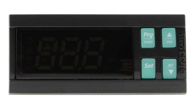 The CAREL IR33 series temperature controller has a supply voltage rating of 12VAC to 24VAC. This controller has a width of 34.2mm and a height of 76.2mm. It has one relay output for use in static refrigeration units. This controller has two NTC inputs. It is used in ventilated refrigeration units with compressor, defrost and fan control with an additional auxiliary output._x000D_