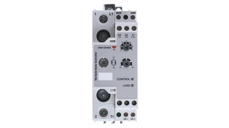 The Carlo Gavazzi RGC1P series SSR power controller has a solid-state contactor supplied with the integrated heatsink. It required analogue input and a current rating of 30A. It is used to control the output power of single-phase loads with an analogue control input. It has selectable switching modes regulated with a knob on the front of the controller. This also allows phase angle control, full-cycle control, advanced full-cycle control, and soft starting. The output of the power controllers is protected against overvoltages by an integrated varistor across the output._x000D_