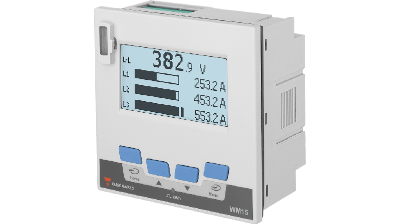 The Carlo Gavazzi WM15 is a power analyser for single-, two- and three-phase systems. Depending on the model, WM15 is equipped with a static output (pulse or alarm) or with a static output and a Modbus RTU communication port._x000D_