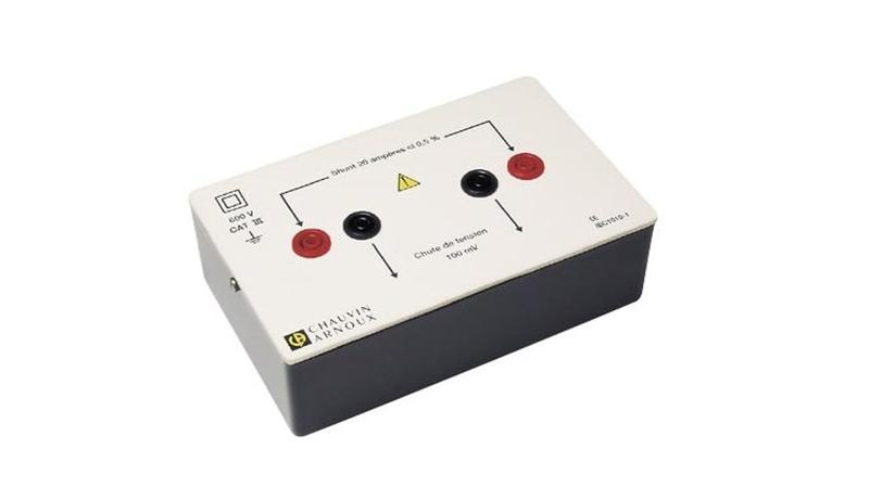 The Chauvin Arnoux shunt is in casing with double insulation for training purposes. It has red current terminals black voltage terminals. It is compliant with the IEC 1010-1 safety standard. It has nominal 5A current range and 0.1V current. It is intended for use indoors._x000D_