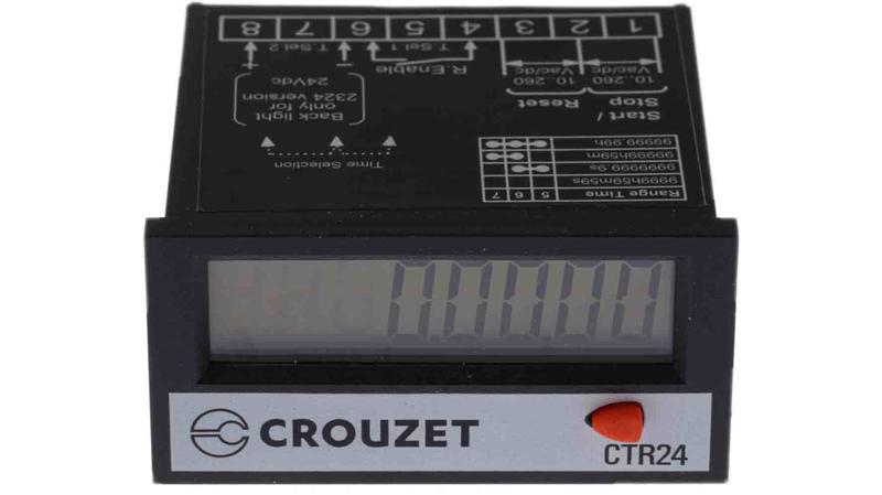 The Crouzet CTR24 series digital counter is an impulse, panel mount and is powered by an internal lithium battery device. This counter has a voltage input device and has an 8-digit LCD display. This device has four timing ranges from 0 to 99.999.99 hours, 0 to 99.999.59 hours, 0 to 999.999.9 seconds, and also 0 to 9.999 hours 59 minutes and 59 seconds. This counter supplies a voltage rating of 260VAC/VDC._x000D_