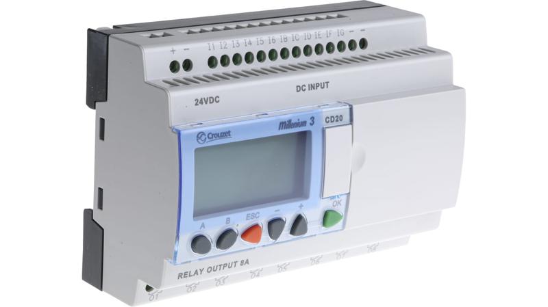 The Crouzet millennium 3 series is a 12 inputs (6 analogues inputs with 10-bit resolution) and 8 outputs. It has a large memory for applications that require larger space. This logic modules voltage rating is 24VDC and output current rating is 8A.This_x000D_