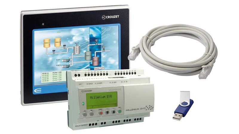 MilleniumEVO KIT, Smart Relay with embedded ethernet XDP24-E, Crouzet Touch CTP104-E Performance, Ethernet cable, USB Key