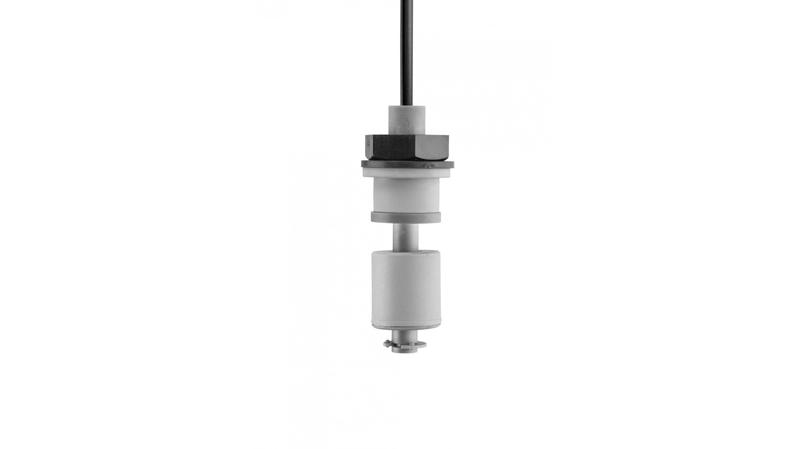 A single switching point, miniature, vertical fluid level switch. These level switches can be mounted on the top or bottom of the tank and are installed with a compression seal so no access is required to the interior of the tank. Vertical level switches offer long-term reliability and minimal maintenance due to the simplistic construction. The switch can be changed from normally open to normally closed simply by removing and inverting the float.