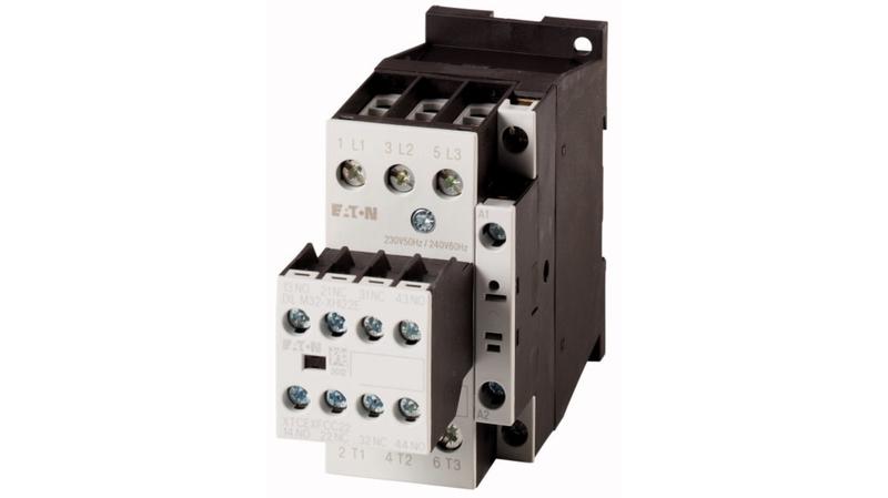 The Eaton series DILM is a 3 pole contactor that comes with 2 N\O, 2 NC, DC operation and spring loaded terminals. Suitable for motors with efficiency class IE3. This contactor have auxiliary current, coil, and main current terminals with spring-cage connection technology. The DILM contactor series is characterized by its compact dimensions._x000D_