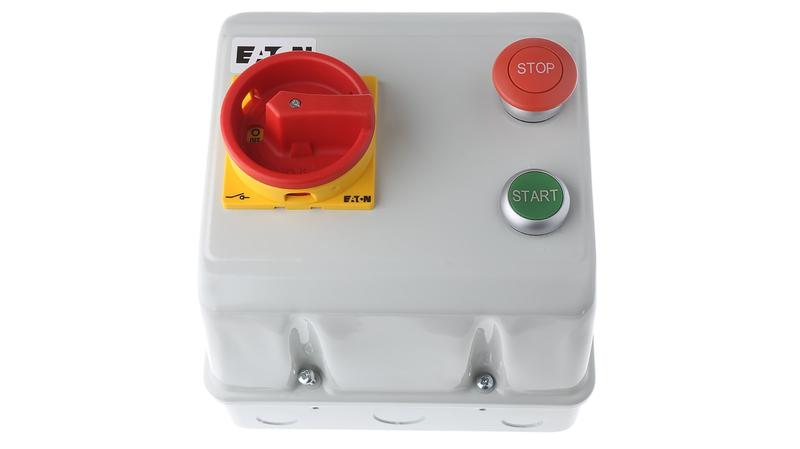 IP55 sheet steel enclosed starter complete with isolator for DOL applications to comply with IEE Regulations, 16th Edition on Isolation and Switching. AC-3 rated triple pole contactor with IP20 terminals and triple pole AC-3 rated switch disconnector with IP20 terminals fitted as standard. The disconnector has provision for up to 3 padlocks. The mushroom headed 'Stop' pushbutton is IP65 with the 'Start' pushbutton having an IP65 flush operator, both have IP20 terminals. Manufactured using readily available Eaton components which comply with the following specifications: isolator: IEC 943-3, pushbuttons: IEC 947-5-1, contactor: IEC 947-4-1. The enclosure is pre-wired to accept the Eaton Z00 or ZB thermal overloads which offer single phasing sensitivity to IEC 947-4. DOL starters comprise of an enclosure, switch disconnector, stop and start pushbuttons and a contactor._x000D_