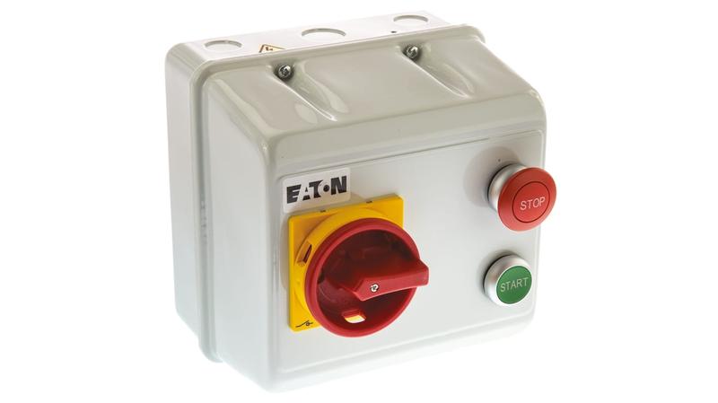 D.O.L - Steel Enclosure_x000D_ IP55 sheet steel enclosed starter complete with isolator for DOL applications to comply with IEE Regulations, 16th Edition on Isolation and Switching. AC-3 rated triple pole contactor with IP20 terminals and triple pole AC-3 rated switch disconnector with IP20 terminals fitted as standard. The disconnector has provision for up to 3 padlocks. The mushroom headed 'Stop' pushbutton is IP65 with the 'Start' pushbutton having an IP65 flush operator, both have IP20 terminals. Manufactured using readily available Eaton components which comply with the following specifications: isolator: IEC 943-3, pushbuttons: IEC 947-5-1, contactor: IEC 947-4-1. The enclosure is pre-wired to accept the Eaton Z00 or ZB thermal overloads which offer single phasing sensitivity to IEC 947-4. DOL starters comprise of an enclosure, switch disconnector, stop and start pushbuttons and a contactor._x000D_ Overload relay is not supplied and must be ordered separately_x000D_ Fitted with 4x20mm and 2x25mm knockouts_x000D_ H184 x W184 x D184mm_x000D_ Note_x000D_ FLC figures quoted are maximum, other overload ratings can be used dependent on FLC rating._x000D_ Note_x000D_ Eaton formerly known as Moeller