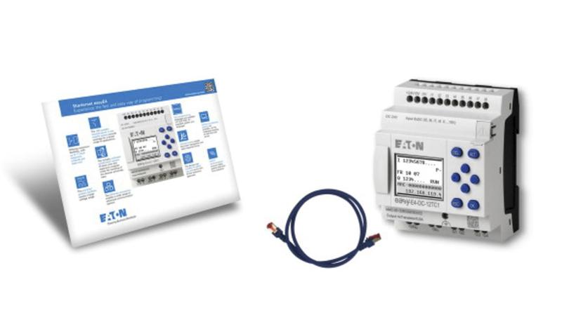 Eaton's easyE4 Starter set package for getting started with control engineering quickly and easily. The starter package contains the EASY-E4-DC-12TC1 PLC control relay with LCD display and screw terminal connections, a patch cable for connecting the control relay to the Ethernet interface and a license for the easySoft operating and programming software._x000D_