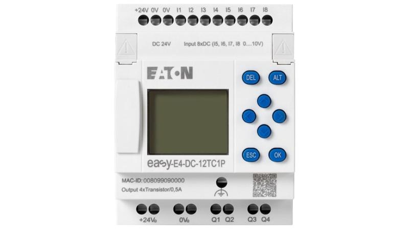 The Moeller Electronic control relay has rated operating voltage of 24 VDC. It has 8 digital inputs of which 4 inputs can also be used as analog inputs and 4 inputs can be used as high-speed counters. The control relay has 4 transistor outputs for 24 VDC. The easy-E4 control relay is equipped with a display, a clock, an integrated Ethernet interface and push-in terminals._x000D_
