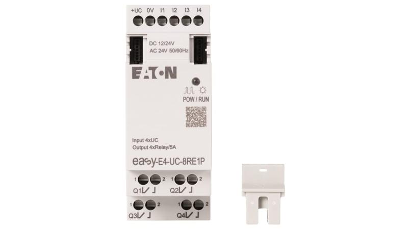The Moeller I/O expansion is for control relays in the easyE4 series with a rated operating voltage of 12 VDC, 24 VDC or 24 VAC. This expansion provides 4 digital inputs for 12 VDC, 24 VDC or 24 VAC and 4 relay outputs for 12–250 VAC or 12–220 VDC. Connections are established using push-in terminals. The connection to the control relay or any other expansion in the easyE4 series is established using the EASY-E4-CONNECT1 connector (item 197225), which is included as standard._x000D_