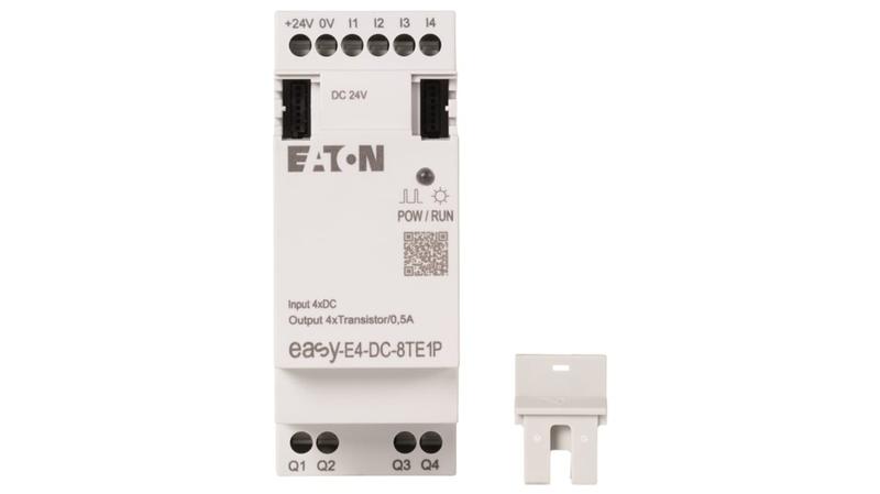 The Moeller I/O expansion for control relays in the easyE4 series with a rated operating voltage of 24 VDC. This expansion provides 4 digital inputs for 24 VDC and 4 transistor outputs for 24 VDC. Connections are established using push-in terminals._x000D_