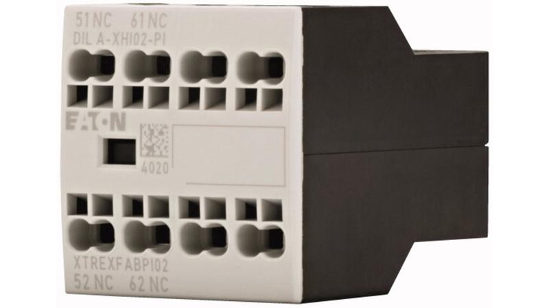 The Eaton Auxiliary contact module with interlocked opposing contacts is rated for operating current of 16 A. The device is available with Push-in terminals connection. It has an operating temperature range of -25°C to 60°C. It has a Spring clamp type of electrical connection and also offers Finger-safe and back-of-hand proof terminals connection._x000D_