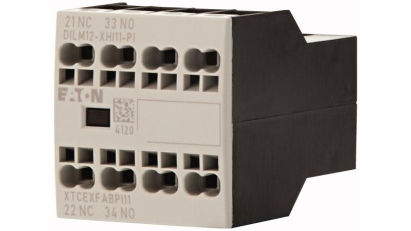 The Eaton Auxiliary contact module with interlocked opposing contacts is rated for operating current of 16 A. The device is available with Push-in terminals connection. It has an operating temperature range of -25°C to 60°C. It has a Spring clamp type of electrical connection and also offers Finger-safe and back-of-hand proof terminals connection._x000D_