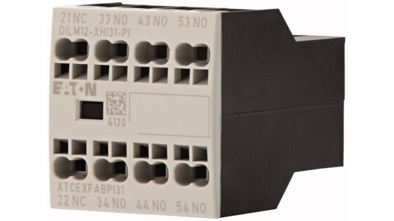 The Eaton Auxiliary contact module with interlocked opposing contacts is rated for operating current of 16 A. The device is available with Push-in terminals connection. It has an operating temperature range of -25°C to 60°C. It has a Spring clamp type of electrical connection and also offers Finger-safe and back-of-hand proof terminals connection._x000D_