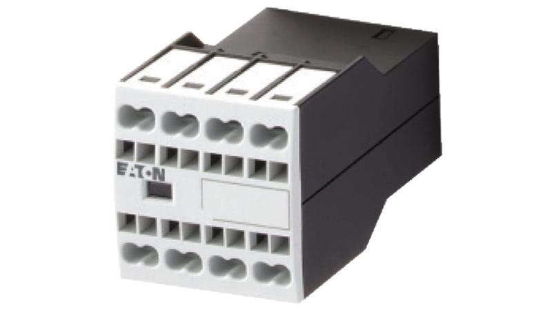 The Eaton Auxiliary contact module comes with interlocked opposing contacts works with an voltage rating of 500 volts and current rating of 16 ampere._x000D_