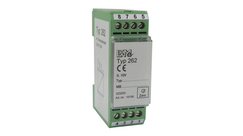 The LKM 262 is a digital programmable measuring transducer which is for mounting on a standard rail. The transducer can be programmed for different thermocouples according to DIN EN 60584-3. The LKM 262 converts the temperature dependent thermoelectric voltage of the sensors temperature linearly into a standard signal. The signal ranging from 0 to 10V. The temperature compensation_x000D_