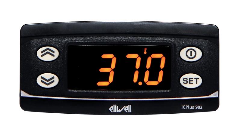 The Eliwell IC PLUS 902-V/I-12V Temperature controllers and Process controllers with one intervention point displays the process value, labels of parameters, alarms and functions._x000D_