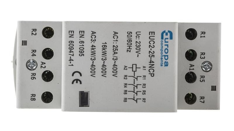 Europa Components EUC2 series 4 pole modular contactors. These units are DIN Rail mounted and designed for installation in consumer units and three phase distribution boards. Ideal for heating lighting and building service type applications._x000D_