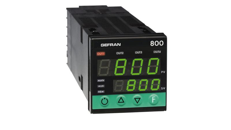 The Gefran 800 series Microprocessor controller, format 48x48 (1/16 DIN) manufactured using SMT. Provides a complete operator interface protected by a Lexan membrane that ensures level IP65 faceplate protection. It has 4 keys, two green LED displays, each with 4 digits, 4 red signal LEDs for the 4 logic or relay outputs, and 3 other programmable LEDs to signal the various operational states of the instrument._x000D_
