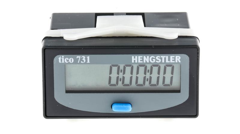 The Hengstler TICO 731 series hour counter is an 8-digit self-powered electronic elapsed time meter with an LCD display. It is supplied with a spring clip for panel mounting. This counter displays in hours, minutes and seconds (HHHH:MM:SS). It can be used in conjunction with a P/E switch to convert a continuous pneumatic signal to a digital display. This time counter can be reset externally or by pressing the front reset button that can also be disabled via a bridge wire. It has a maximum count frequency of 30Hz._x000D_