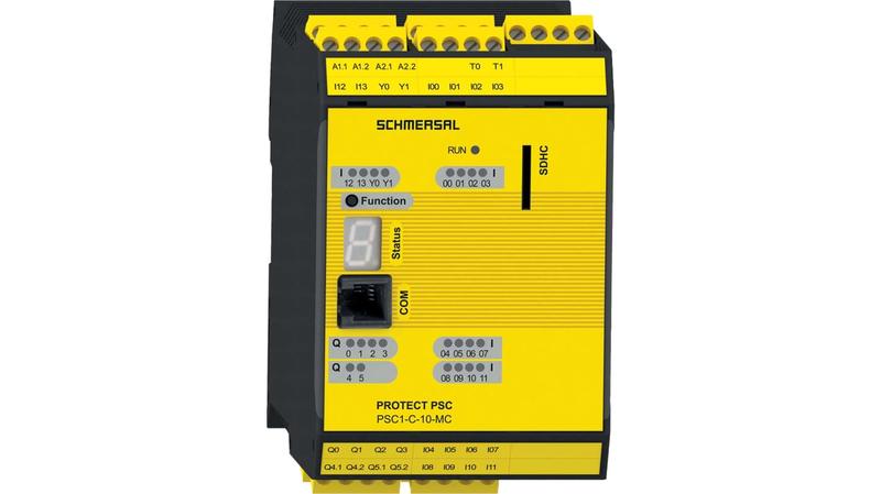 The Schmersal PSC1-C-10-MC safety controller has removable screw terminals and can be clipped into standard rail. It has short-circuit proof, p-type (Q2 und Q3) as safety output._x000D_