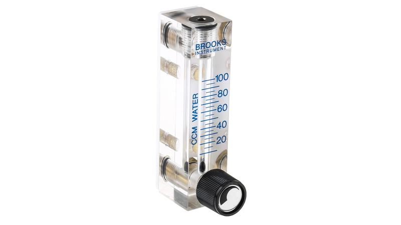 The Key Instruments FR2000 series variable area flow meter measures the liquid flow rate of 10 ccm to 100 cm³/min. This is a standard, precision-machined, acrylic flow meter for liquids or gases. It has direct-reading air or water scales and is available in either English or metric scales. This is a durable and affordable product that provides highly repeatable results. It can be configured with a control valve on the inlet. The fittings and the valve are specified in brass and the O-rings are provided with Buna-N. These precision-machined, 1-piece, acrylic-body blocks can handle demanding projects and mounting panels along with high durability. It is used for many non-corrosive, low-pressure air, water and gas flow applications._x000D_