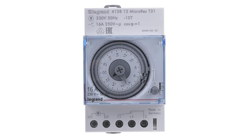 Legrand MicroRex Analogue Time Switch_x000D_ Legrand MicroRex programmable time switches with analogue dial._x000D_ Daily Programme (897-6788, 897-6891, 897-6920, 897-6797 & 897-6908)_x000D_ DIN Rail mounting_x000D_ 24 h programme_x000D_ 1 channel_x000D_ Programmed via captive segment_x000D_ Manual changeover to summer/winter time_x000D_ Minimum switching time between 15 or 30 min, depending on model_x000D_ 230 V supply voltage_x000D_ Weekly Programme (897-6905)_x000D_ DIN Rail mounting_x000D_ 7-day programme_x000D_ Programmed via captive segment_x000D_ Manual changeover to summer/winter time_x000D_ Minimum switching time between 2 and 4 h, depending on model_x000D_ 100 h working reserve_x000D_ 230 V supply voltage_x000D_ Analogue