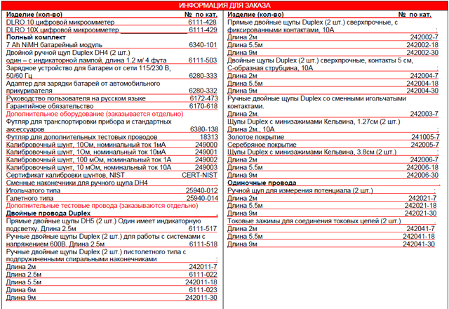 Сравнительная таблица характерстик микроомметров серии DLR: