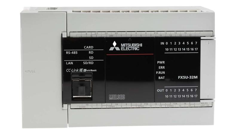 The Mitsubishi FX5U series iQ platform compatible programmable logic controller (PLC) has 16 digital input (type 24VDC sink/source) and 16 relay/transistor outputs. MELSEC communication protocol (3C/4C Frames) and MELSOFT connection. It has 64k steps program capacity and 16 built-in inputs. The FX5U continues the FX tradition of total flexibility by offering a huge range of new and existing add-on options. It further enhances the built-in functions of Ethernet, analogue I/O, data logging, position control, security, communication and networking functions incorporated as a standard. It will provide users with the ability to specify more powerful systems, but with fewer overall components, saving time and cost._x000D_