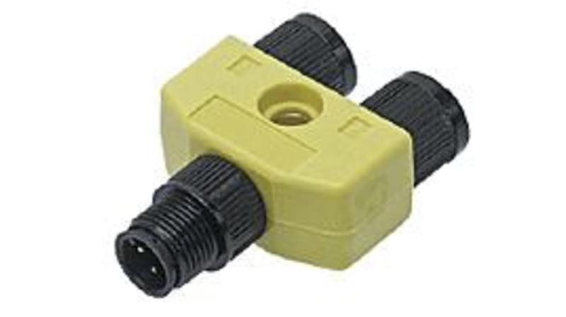 Micro-Change (M12) Solid Body Splitter, 1 x 5-Pole Male to 2 x 5-Pole Females, Black Overmold