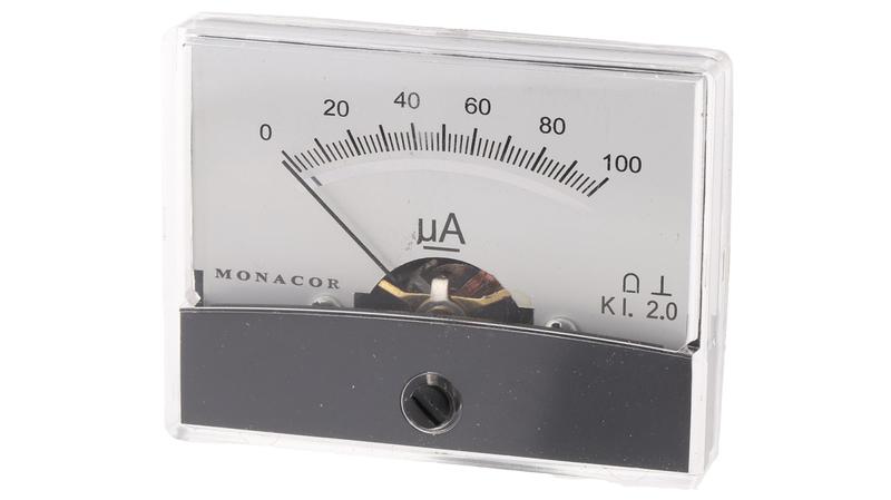 The Monacor PM-2 series moving coil galvanometer measures maximum current rating of 100μA. This moving coil measurement tool measures the accuracy of class 2. It is designed for the production of a wide range of control apparatus with a parallax correction mirror and zero adjustments._x000D_