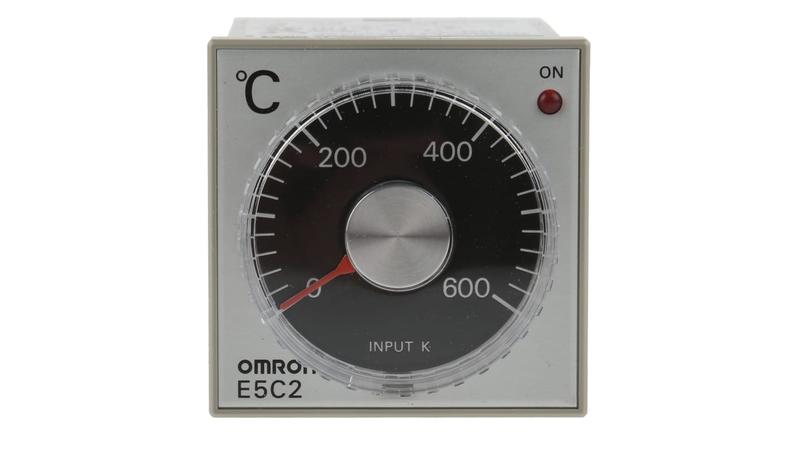 The Omron E5C2 series temperature controller has a supply voltage rating ranging from 100VAC to 240VAC. This controller has a width of 48mm and a height of 48mm. It has a K-type (0°C to 600°C) thermocouple input and relay output for ON-OFF control. The controller has thermocouple element lead wires._x000D_