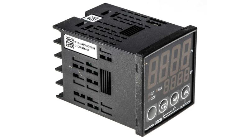 The Omron E5CB series temperature controller has a voltage output of 12VDC, 21mA and single alarm relay output of 250VAC, 1A (resistive load). The sensor type is a thermocouple (K, J, T, R, or S). This controller has a width of 48mm and a height of 48mm 1/16DIN. It is easy to read with one of the largest character display. It has an operating supply of 24VAC/DC._x000D_