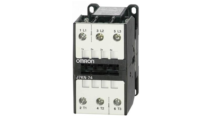 The Omron J7KN series contactor which has coil voltage 24 V dc and has current rating of 74 A. It has electrical connection of screw fixing and snap fitting on a DIN-rail. It has dimension of H112 ´ W60 ´ D113._x000D_