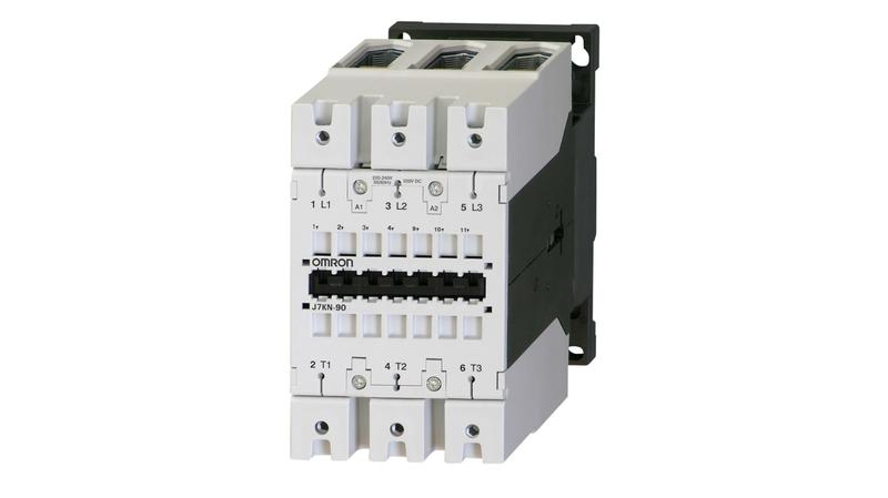 The Omron J7KN series contactor which has coil voltage 230 V ac and has current rating of 90 A. It has electrical connection of screw fixing and snap fitting on a DIN-rail. It has dimension of H155 ´ W90 ´ D136._x000D_