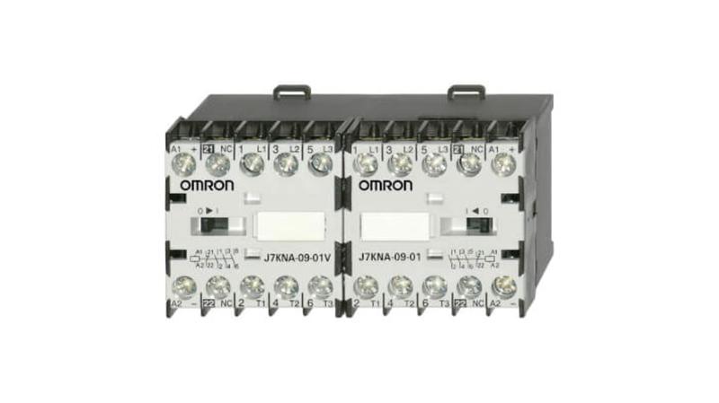 The Omron J7KNA series reversing contactor which has coil voltage 24 V ac and has current rating of 9 A. It has electrical connection of screw fixing and snap fitting on a DIN-rail. It has dimension of H57.5 ´ W94.5 ´ D50._x000D_