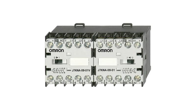 The Omron J7KNA series reversing contactor which has coil voltage 24 V dc and has current rating of 9 A. It has electrical connection of screw fixing and snap fitting on a DIN-rail. It has dimension of H57.5 ´ W94.5 ´ D50._x000D_