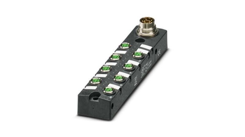 The Phoenix Contact Sensor/actuator box has 8 slots, 3 positions with M8 socket connection system. It has a CuZn contact material, rated voltage of 24 V DC and total rated current of 6 A._x000D_