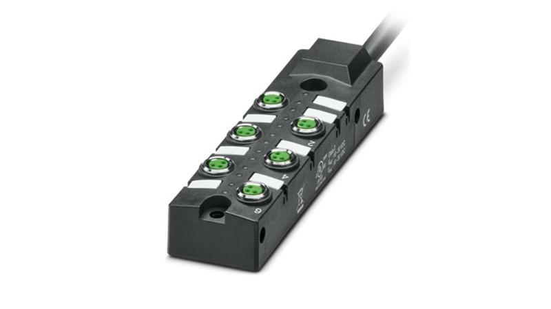 The Phoenix Contact Sensor/actuator box has 6 slots, 3 positions with M8 socket connection system. It has a CuZn contact material, rated voltage of 24 V DC and total rated current of 6 A._x000D_